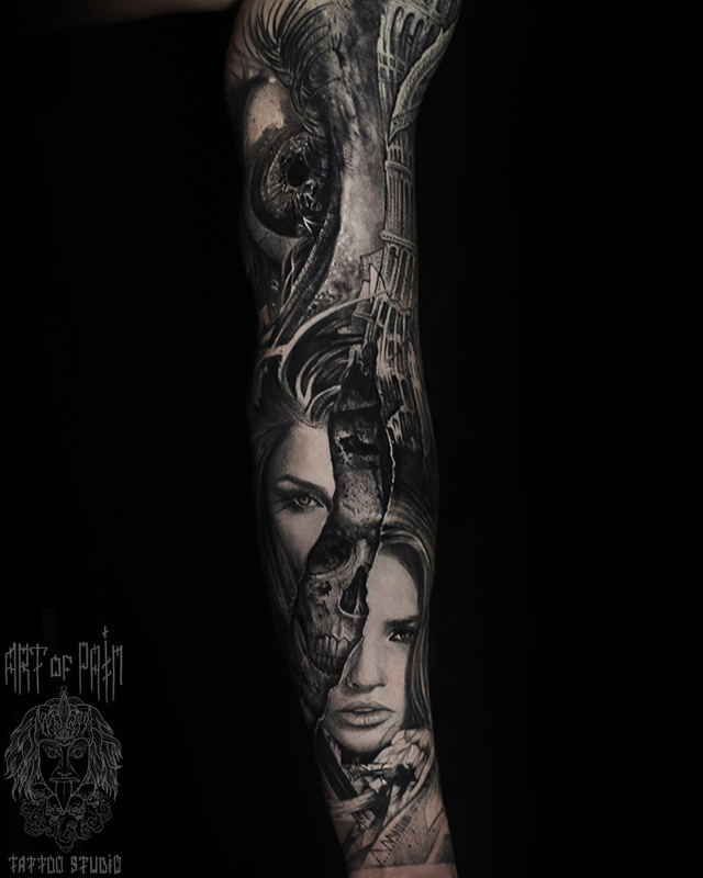 Татуировка мужская хоррор тату-рукав девушка, череп, глаз (Слава Tech Lunatic) 5533