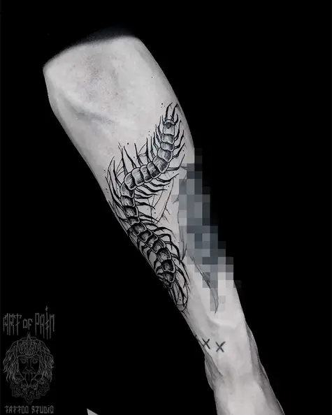 Татуировка мужская графика на предплечье мукаде (Мария Котова) 5551