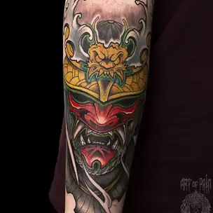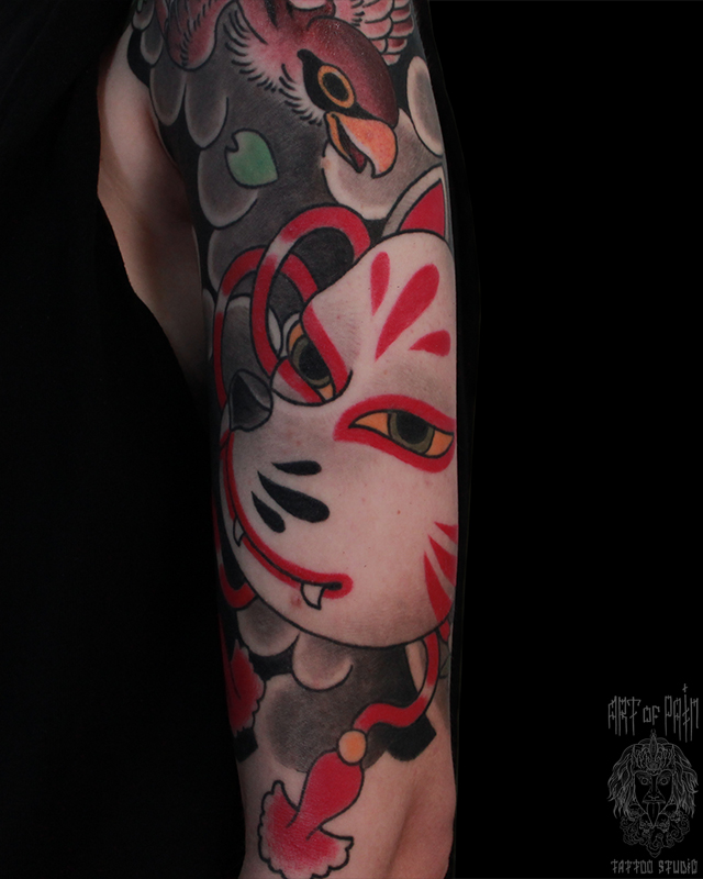 Татуировка мужская япония на плече птица и маска 5560