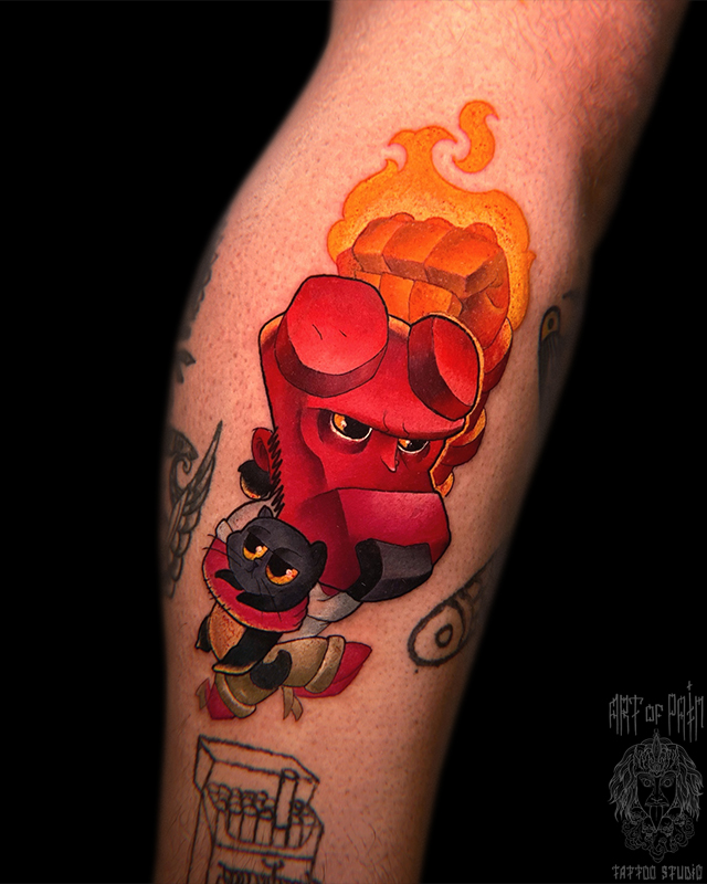 Татуировка мужская нью скул на голени Хеллбой 5565
