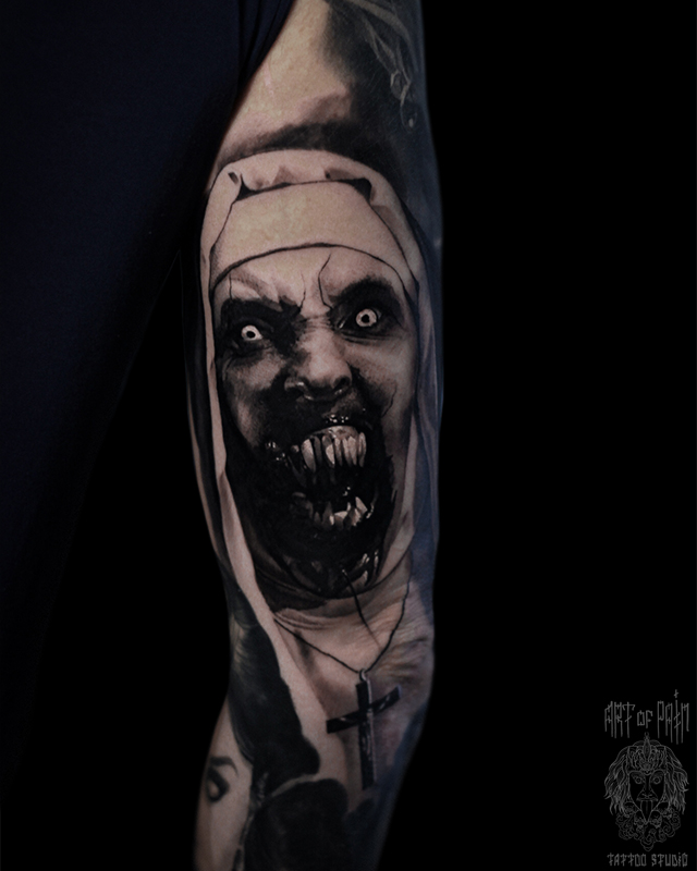 Татуировка мужская хоррор на руке монахиня из фильма "Проклятие монахини" 5596
