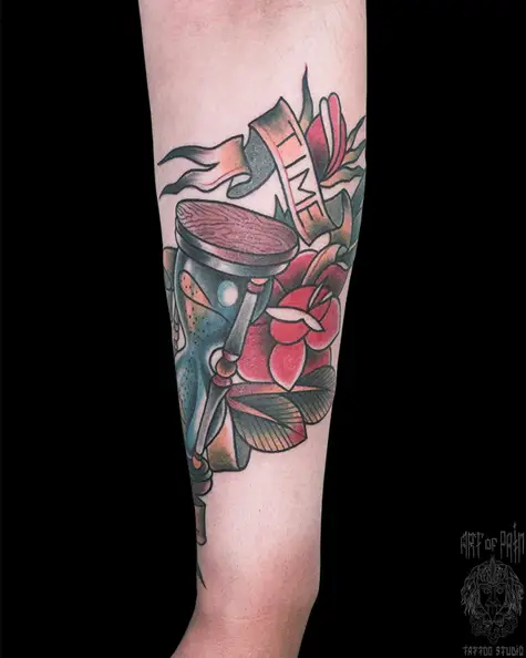 Татуировка мужская нью скул на предплечье часы и розы (Анастасия Родина) 5614