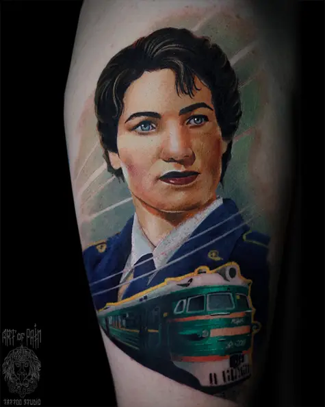 Татуировка мужская реализм на плече портрет и поезд 5656