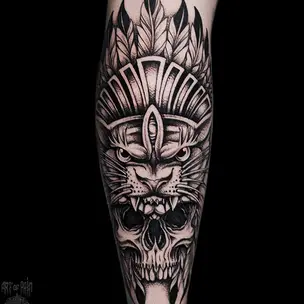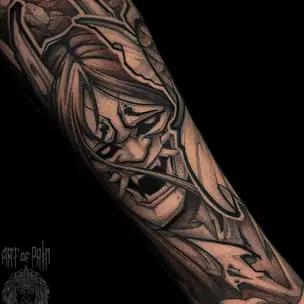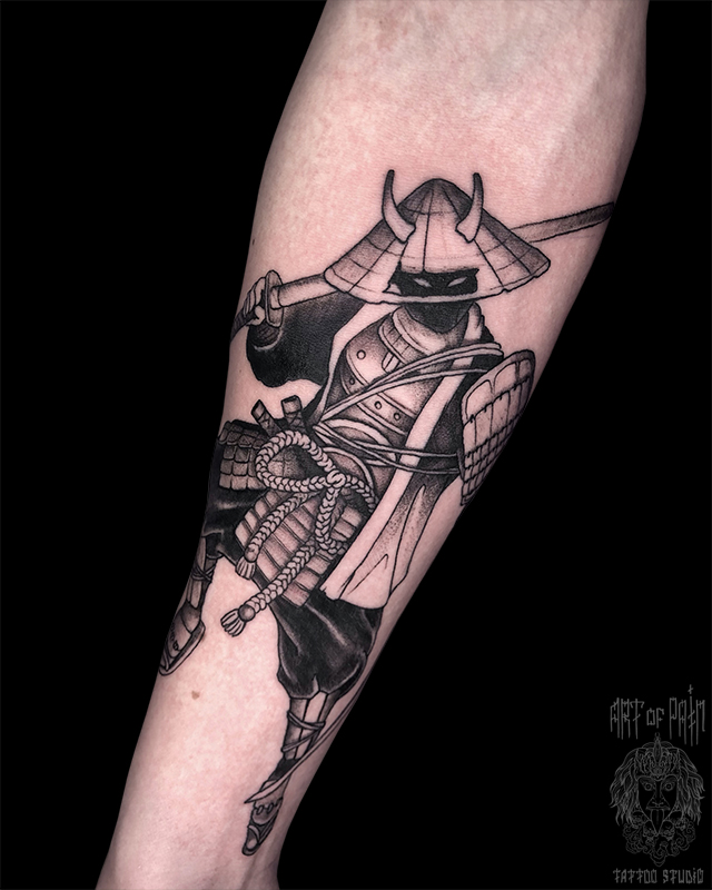 Татуировка мужская графика на предплечье самурай с мечом 5688