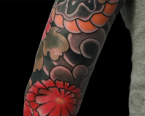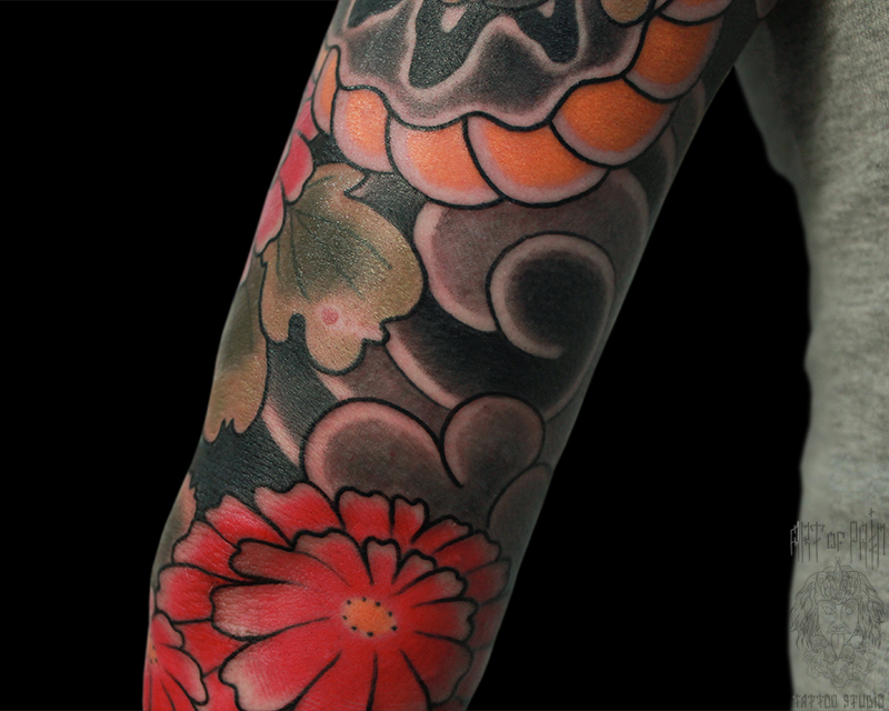 Татуировка мужская япония на предплечье змея, хризантема 5705