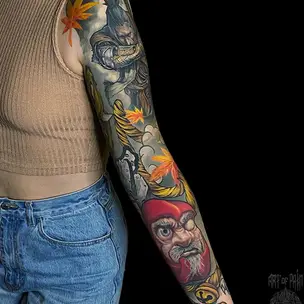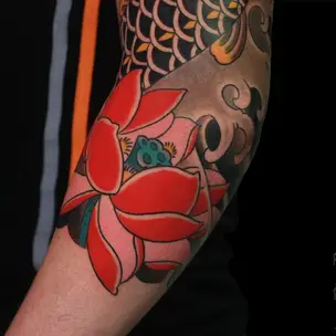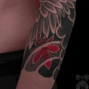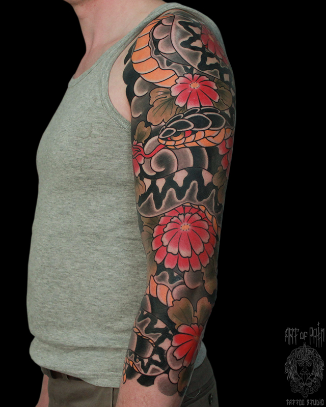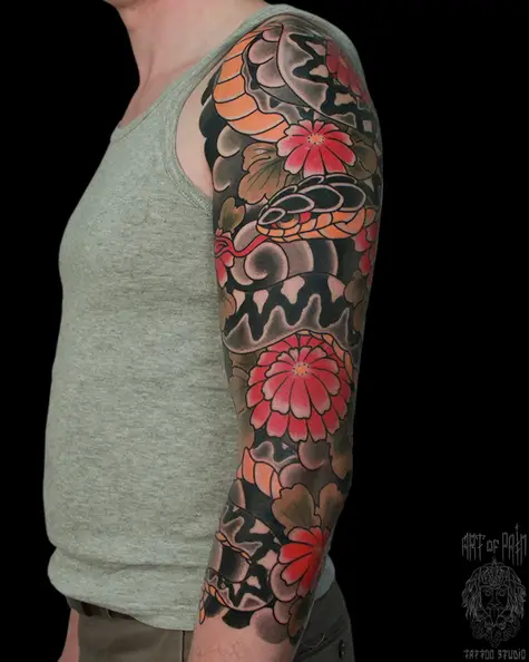 Татуировка мужская япония тату-рукав змея, красные хризантемы 5708