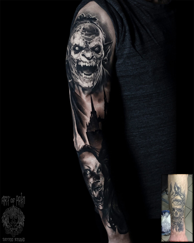 Татуировка мужская хоррор тату-рукав монстр, девушка кавер 5719