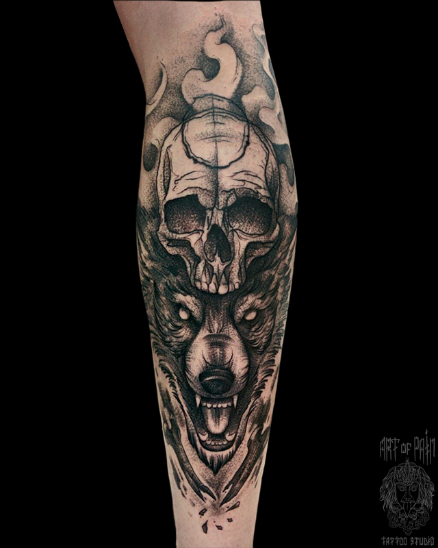 Татуировка мужская графика на голени волк и череп (Евгения Шмидт) 5743