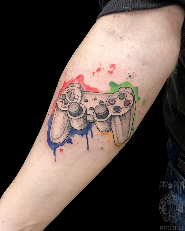 Татуировка мужская акварель на предплечье пульт (Мария Котова) 5803