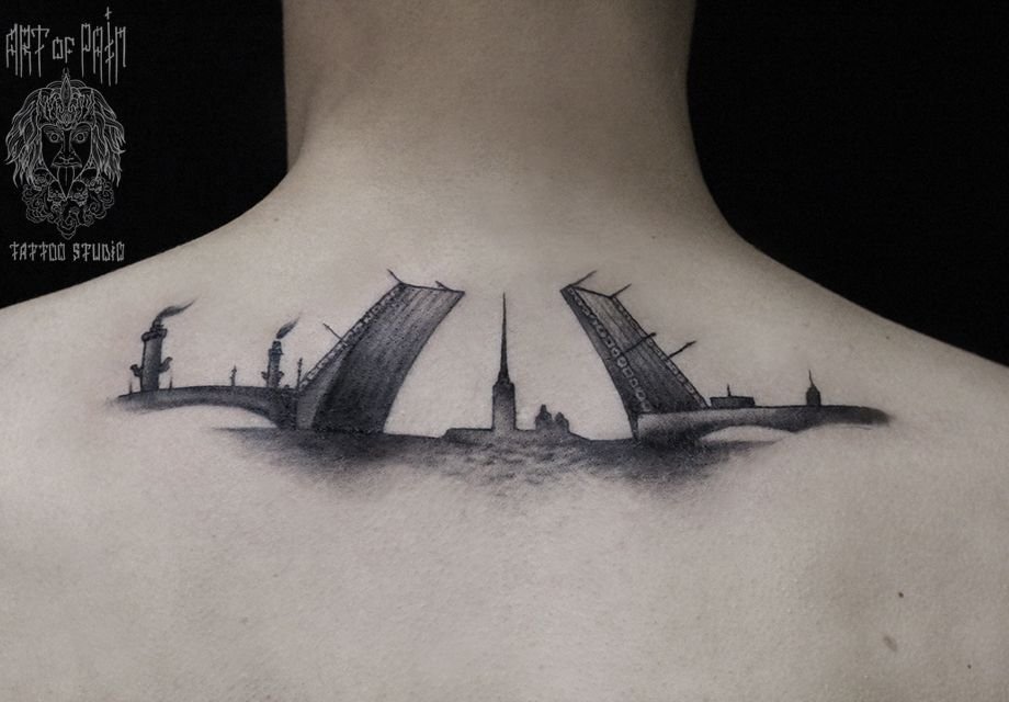 Татуировка мужская Black&Grey на спине мост 581