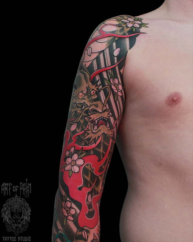 Татуировка мужская япония на плече дракон и цветы 5873