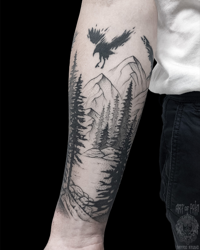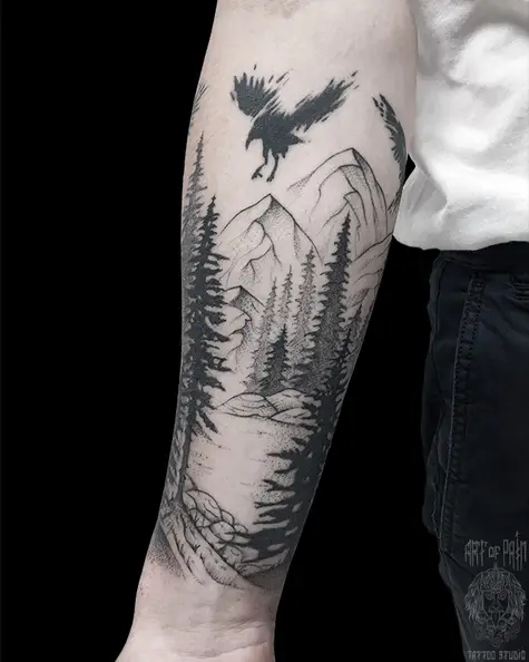 Татуировка мужская графика на предплечье лес, птица (Мария Котова) 5892