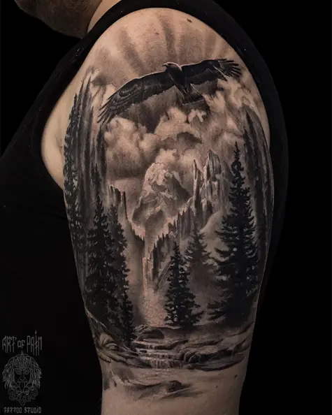 Татуировка мужская реализм на плече пейзаж (Вячеслав Плеханов) 5904