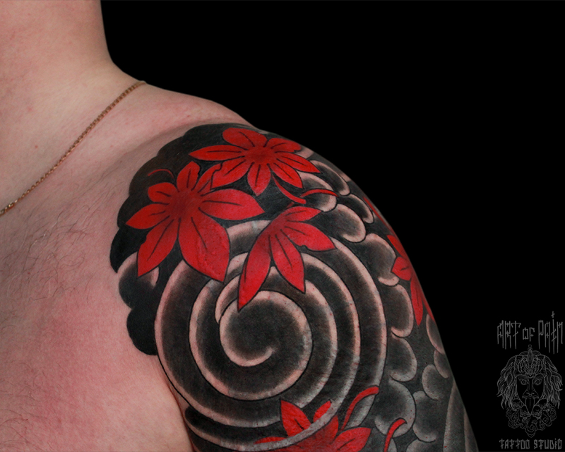 Татуировка мужская япония на плече воздух и кленовые листья кавер 5961