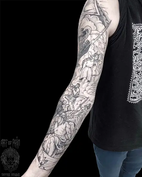 Татуировка мужская графика тату-рукав боги, масонский глаз, люди (Мария Котова) 5978