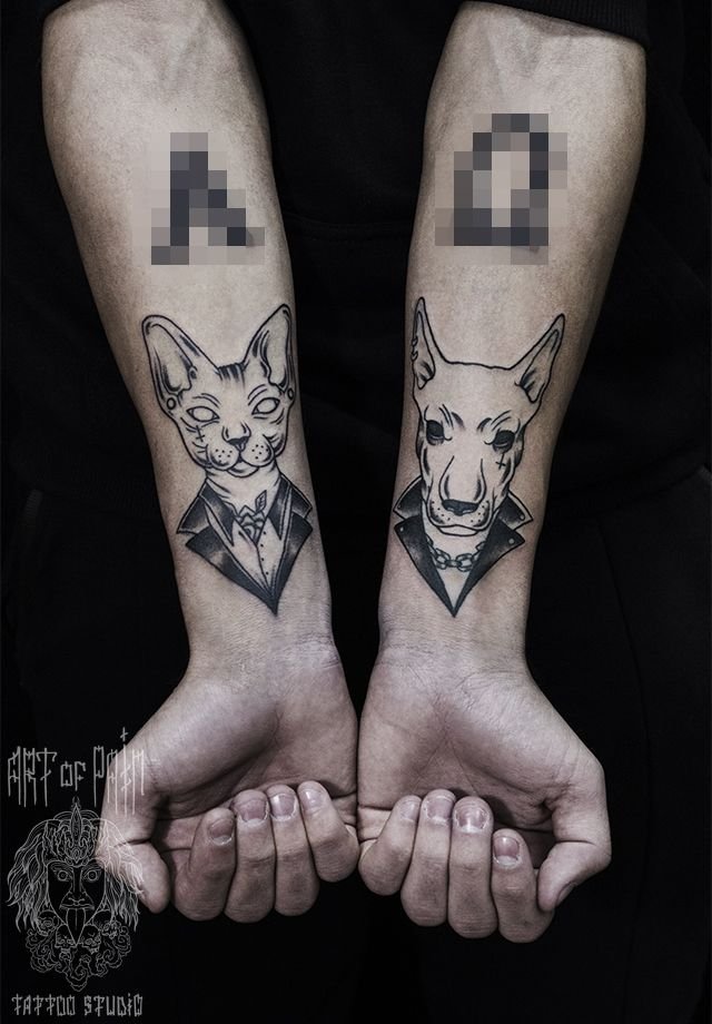 Татуировка мужская графика на предплечьях кот и пёс 597