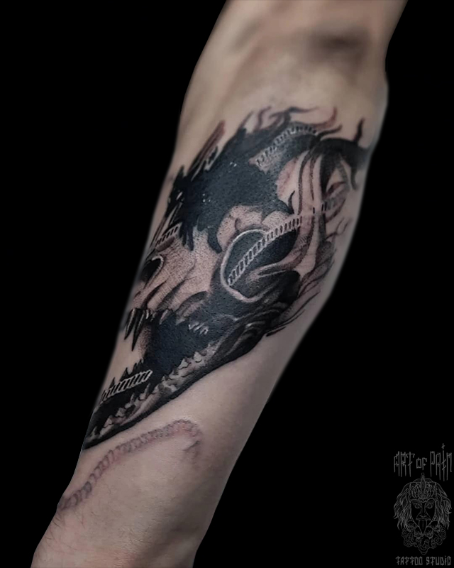 Татуировка мужская графика на предплечье череп животного (Кирилл Плотников) 6023