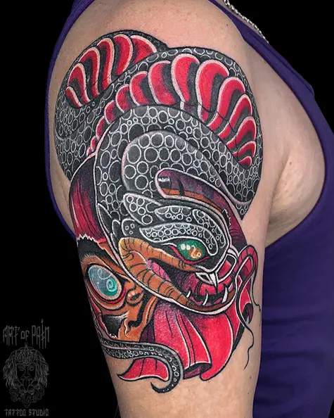 Татуировка мужская япония на плече дарума и змея 6049