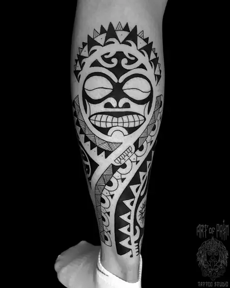 Татуировка мужская полинезия на голени орнамент, маска 6055