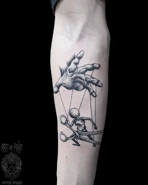 Татуировка мужская графика на предплечье рука и марионетка (Николай Орф) 6112