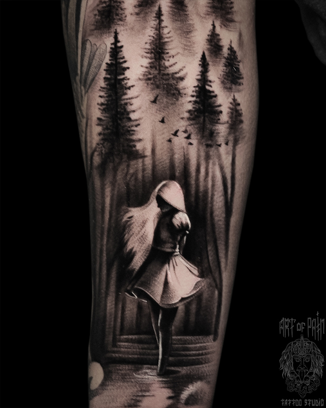 Татуировка мужская реализм на предплечье девушка и лес (Анастасия Юсупова) 6157