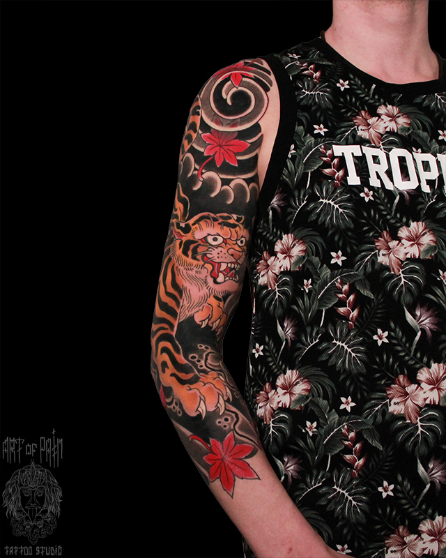 Татуировка мужская япония тату-рукав тигр и кленовые листья (вид спереди) 6211