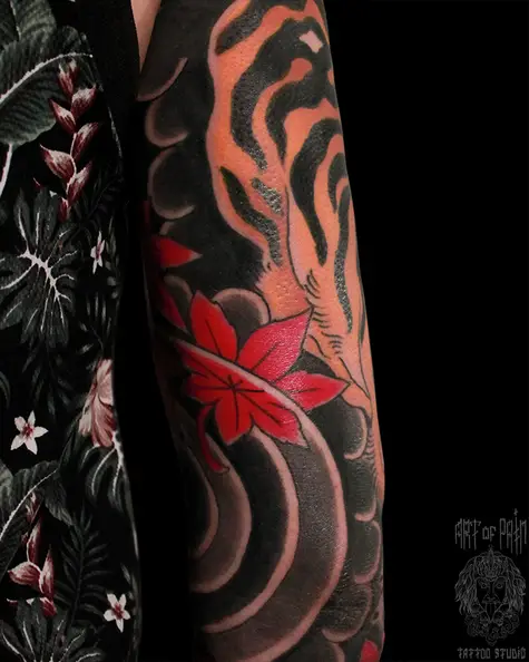 Татуировка мужская япония на руке кленовый красный лист 6216