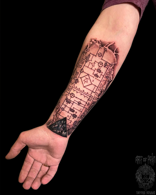 Татуировка мужская графика на предплечье микросхема и треугольник на запястье (Кирилл Плотников) 6222
