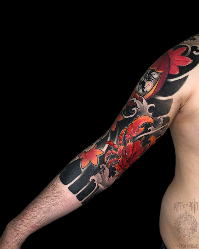 Татуировка мужская япония тату-рукав Дарума и краб 6235
