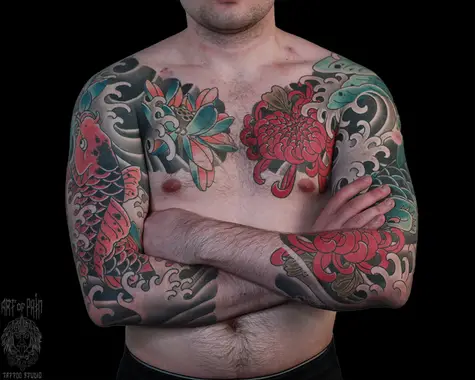 Татуировка мужская япония тату-рукава карпы и лотосы 6268