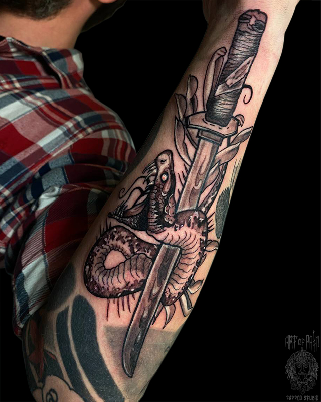 Татуировка мужская нью скул на предплечье змея (Кирилл Плотников) 6315