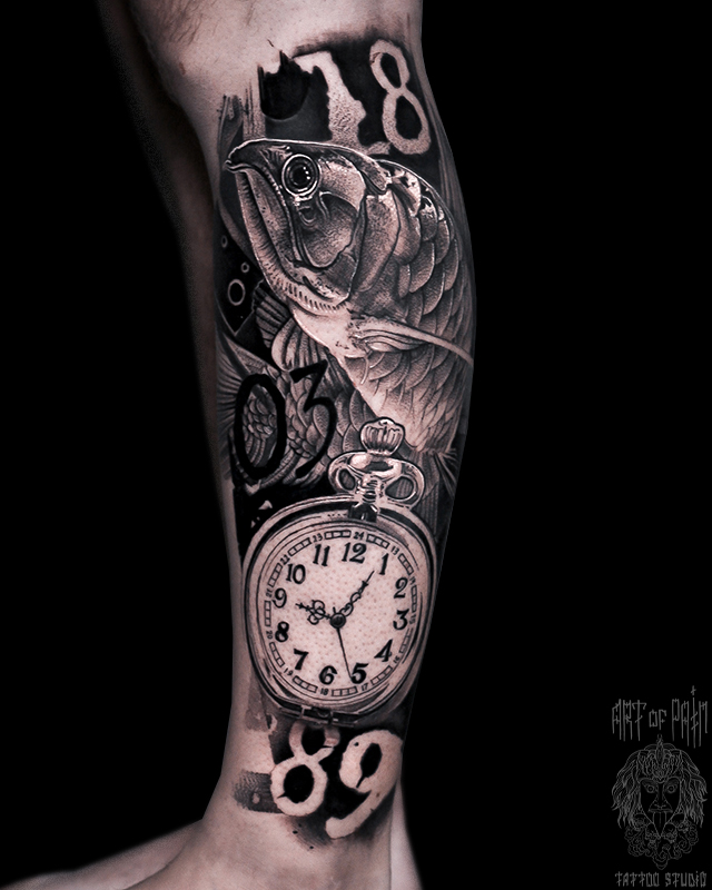 Татуировка мужская реализм на голени карп и часы (Слава Tech Lunatic) 6333
