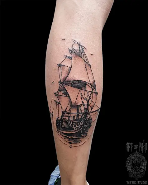 Татуировка мужская графика на голени корабль (Николай Орф) 6368