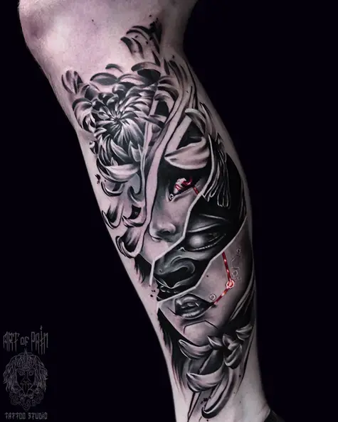 Татуировка мужская япония на голени девушка и маска (Дмитрий Шейб) 6375