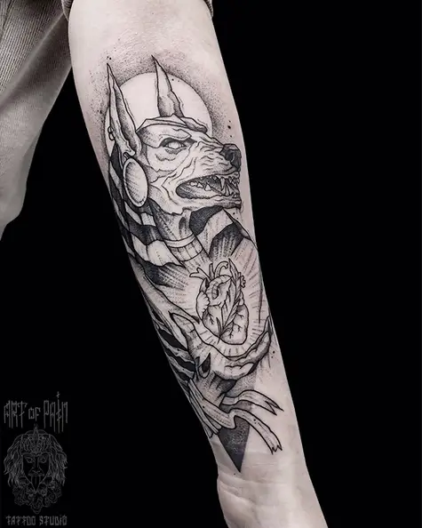 Татуировка мужская графика на предплечье Анубис и сердце (Мария Котова) 6381