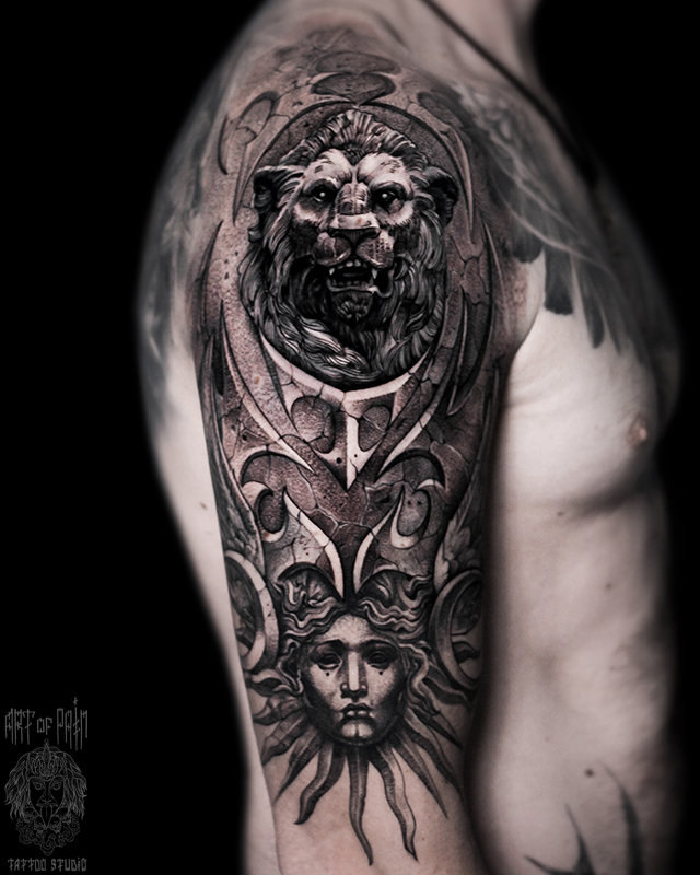 Татуировка мужская реализм на плече доспехи со львом и солнцем (Слава Tech Lunatic) 6408