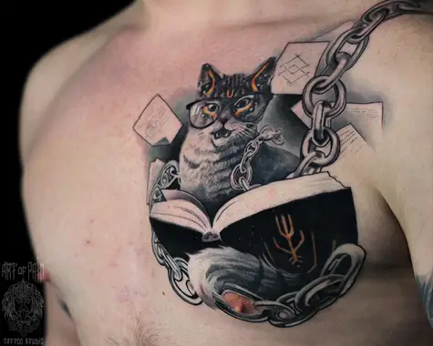 Татуировка мужская фэнтези на груди Кот Учёный 6450