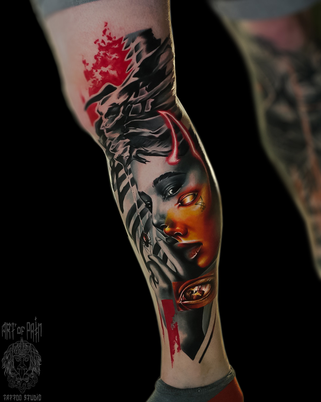 Татуировка мужская реализм и треш-полька на ноге девушка (Дмитрий Шейб) 6461