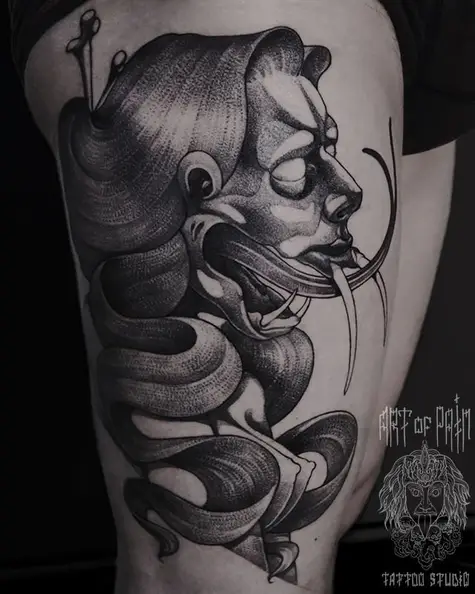 Татуировка мужская графика на бедре демон 648