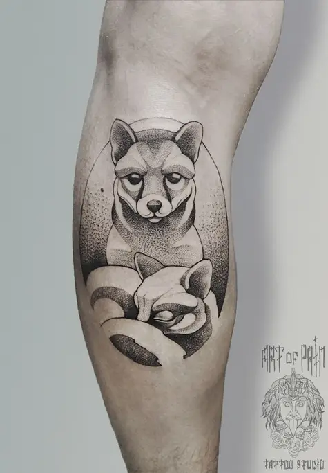 Татуировка мужская графика на икре две лисы 650