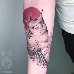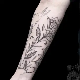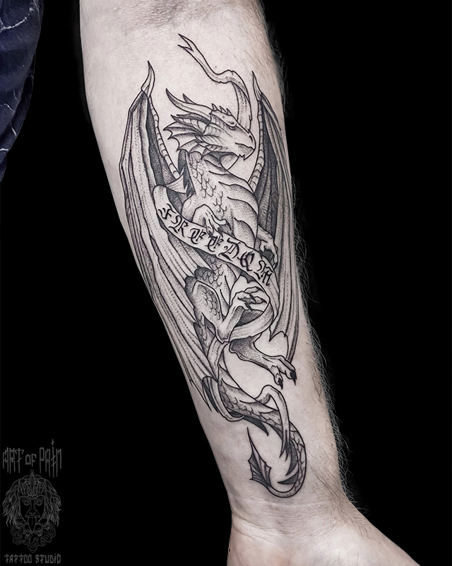 Татуировка мужская графика на предплечье дракон и надпись (Мария Котова) 6514