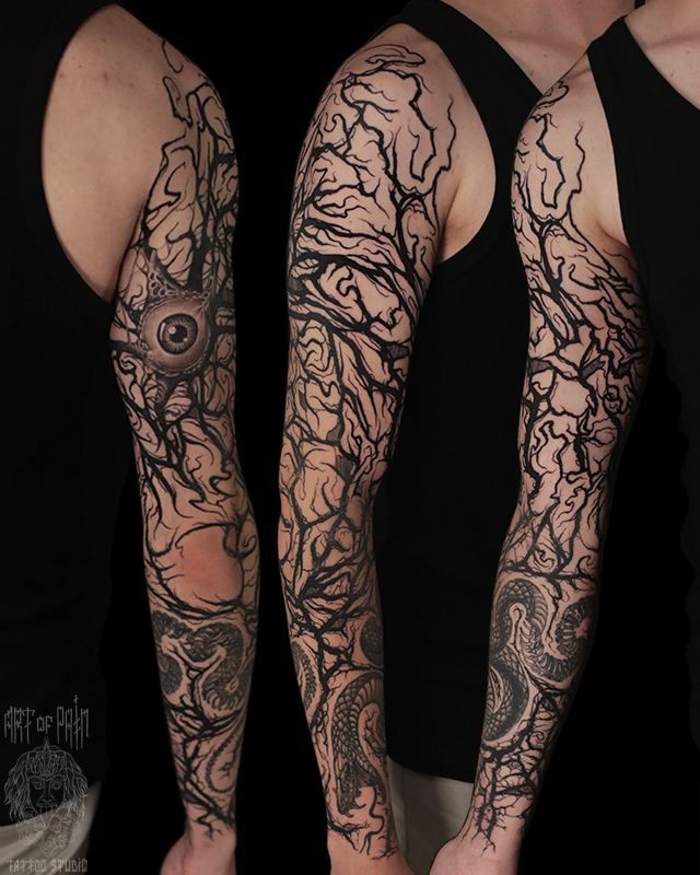 Татуировка мужская графика тату рукав ветки и глаз 6531