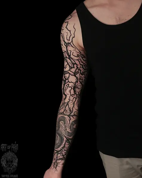 Татуировка мужская графика тату рукав ветки и глаз 6532