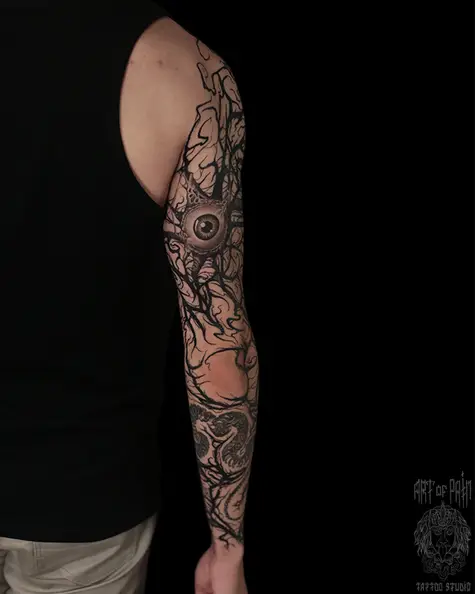 Татуировка мужская графика тату рукав ветки и глаз 6534