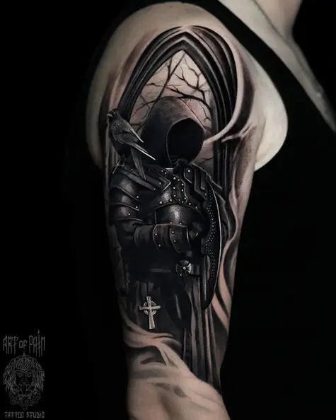 Татуировка мужская реализм на плече рыцарь (Анастасия Юсупова) 6535