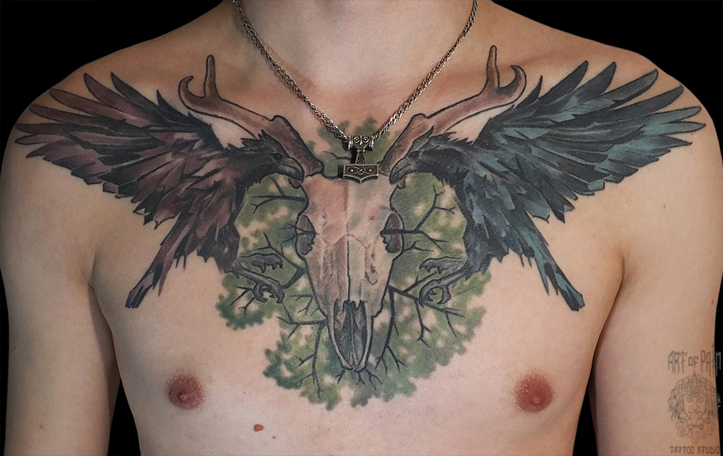 Татуировка мужская нью скул на груди череп и вороны 6544