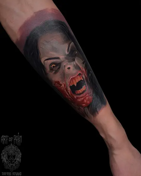 Татуировка мужская реализм и хоррор на предплечье вампир 6547