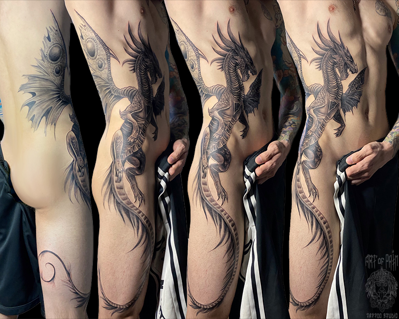 Татуировка мужская графика на боку дракон 6558