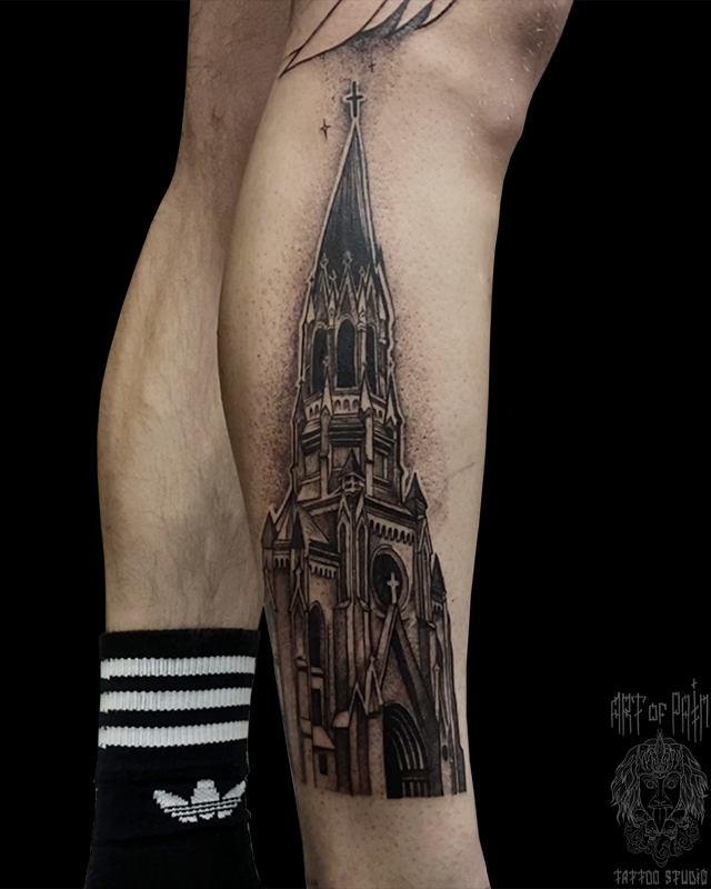 Татуировка мужская графика на голени замок 6562