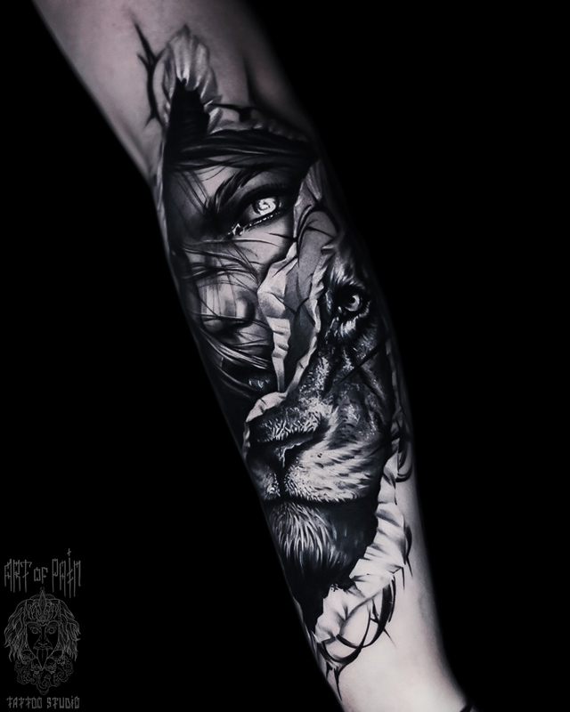 Татуировка мужская реализм на предплечье девушка и львица (Дмитрий Шейб) 6613